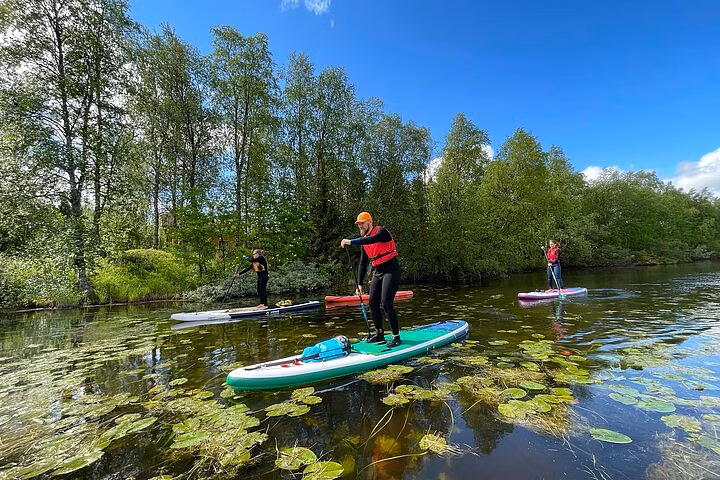 El Día de Deportes Acuáticos Árticos es un día divertido en el lago Rahajärvi que incluye SUP (Stand Up Paddleboarding), Snorkel y sauna en tienda de campaña. Para los mayores de 12 años, existe la posibilidad opcional de una introducción al buceo.