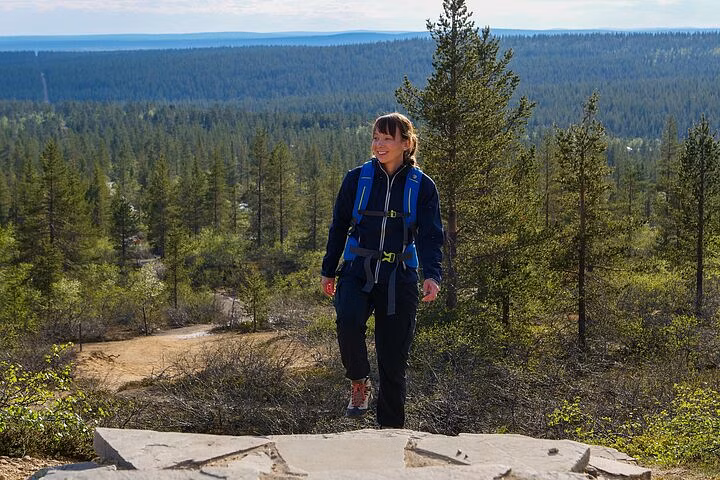 Nuestra excursión comienza desde la carretera donde dejamos el coche y comenzamos a caminar a través del bosque de pinos que lentamente se convierte en un bosque de abedules de montaña y eventualmente en una meseta abierta. En una meseta las pendientes son suaves y la superficie para caminar es mullida con rocas debajo y baya de cuervo, baya de oso de montaña y brezo creciendo como plantas principales. En la cima de la colina podemos ver el valle del río Ivalo hacia el sur y el vasto bosque de pinos hacia el oeste y el norte.